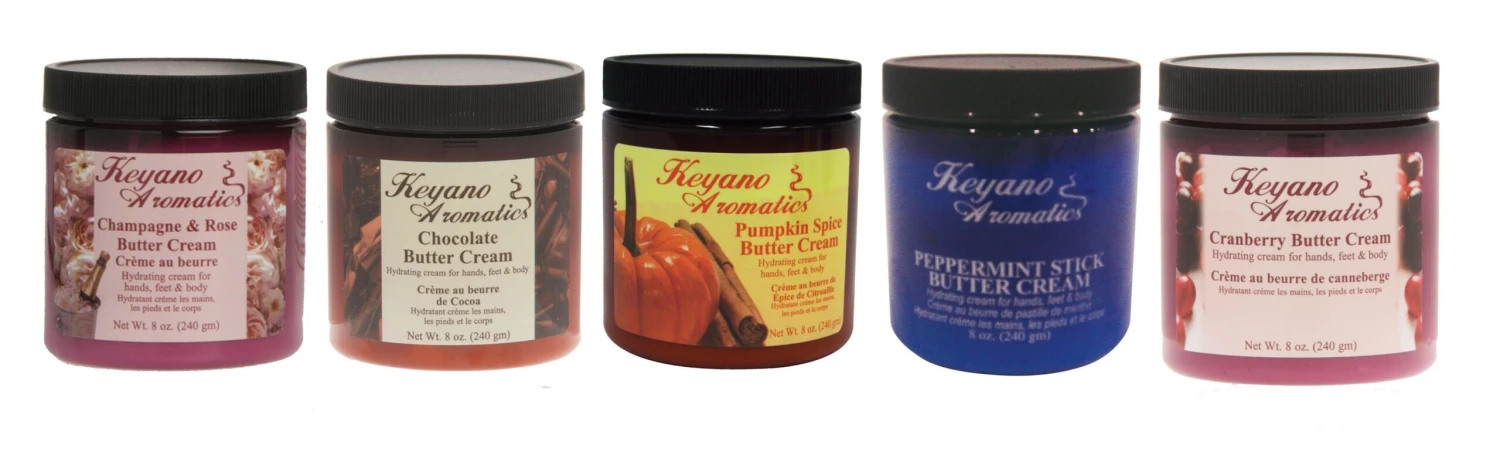 Comfort food for your skin. Keyano Aromatics Butter Cream is a fat-free hydrating indulgence for the hands, feet and body. Shea butter, grapeseed oil and vitamins give nice slip and glide during massage with moderate absorption. This try me kit combines the 5 most popular fragrance profiles into one convenient Try Me Kit. 8 oz jars.