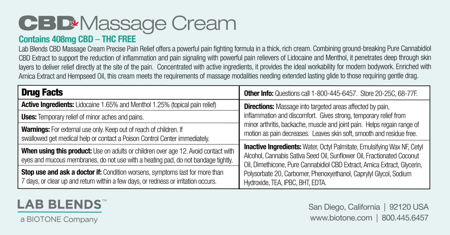 Lab+Blends® 408mg CBD Massage Cream – 7.2 oz By BIOTONE®