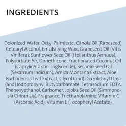 Water, Octyl Palmitate, Canola Oil, Emulsifying Wax, Cetearyl Alcohol, Grapeseed Oil (Vitis Vinifera), Sunflower Seed Oil (Helianthus Annuus), Polysorbate 60, Dimethicone, Fractionated Coconut Oil (Caprylic/Capric Triglyceride), Sesame Oil (Sesamum Indicum Seed Oil), Arnica Montana Extract, Aloe Barbadensis Leaf Extract, Propylene Glycol (and) Diazolidinyl Urea (and) Iodopropynyl Butylcarbamate, Tetrasodium EDTA, Phenoxyethanol, Carbomer, Jojoba Seed Oil (Simmondsia Chinensis), Fragrance, Treithanolamine, Ascorbic Acid (Vitamin C), Tocopherol Acetate (Vitamin E)
